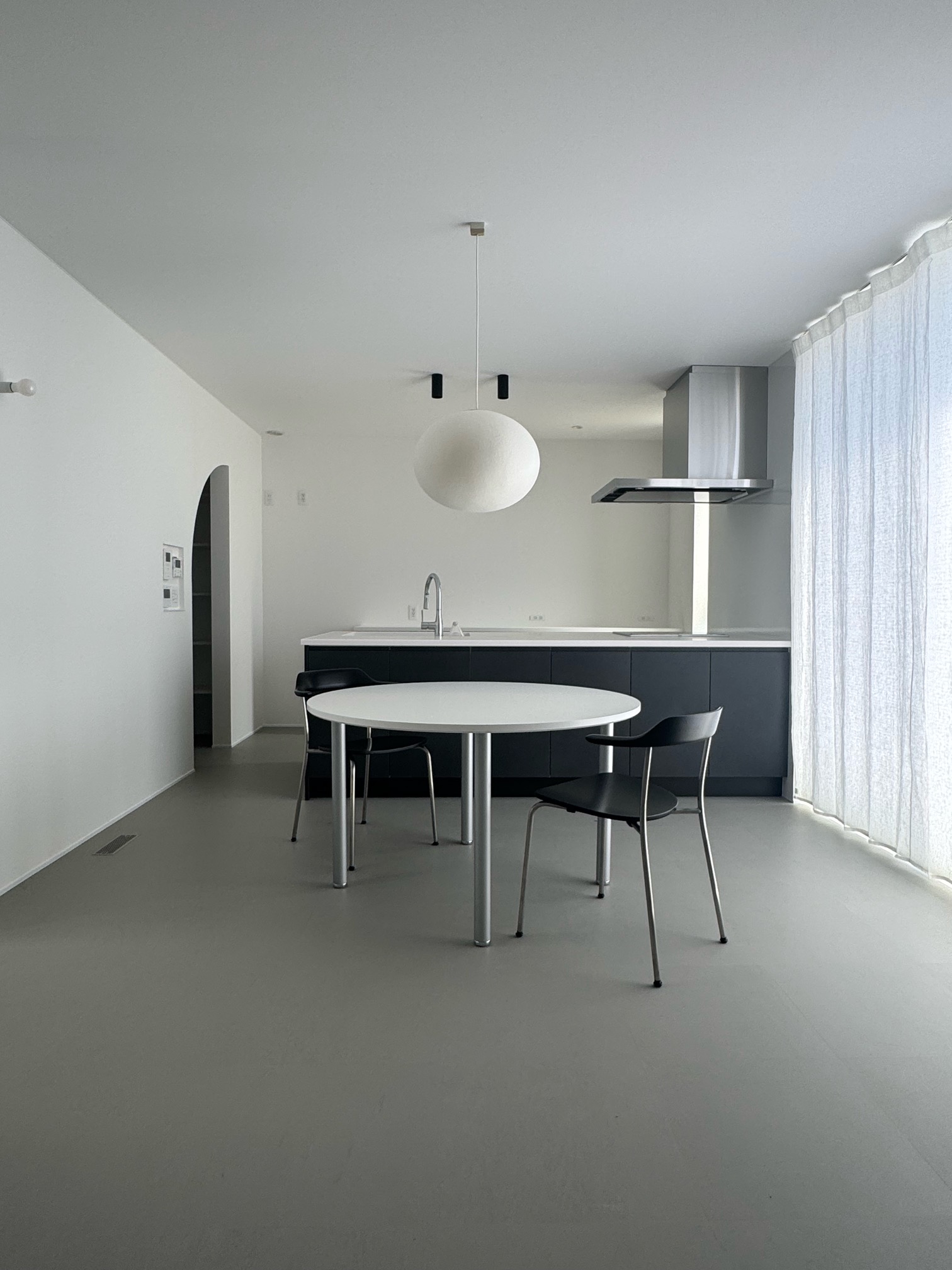 内観は白を基調とし、フロアタイルやキッチンはグレートーンに。